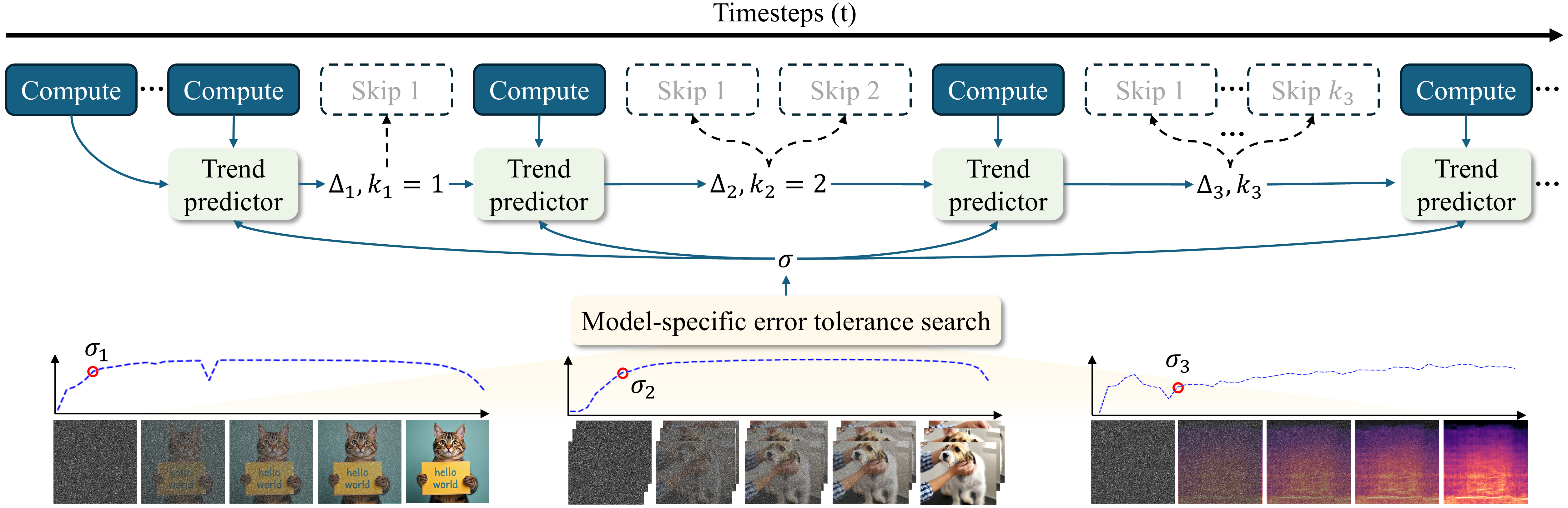 Overview of the proposed ETC. ETC leverages all historical model outputs to estimate future trends and dynamically adjusts approximation frequency according to each model’s error tolerance limit. Trend predictor compute weighted projections of cross-step changes in model outputs and dynamically extends or contracts the approximation window based on whether deviations between projected trends and periodic model inferences remain within the model’s corrective capacity. Model-specific error tolerance search quantify the perceptual influence of deviation perturbations on generation quality and derive critical transition points from volatile semantic planning to smooth quality refinement phases that reflect model limits for error correction.